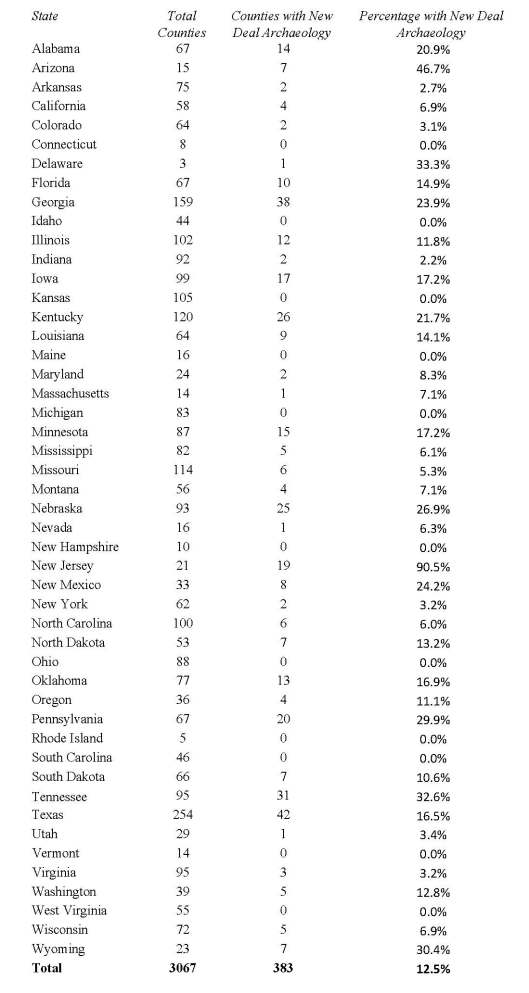 What does three-eighty-three (383) have to do with New Deal archaeology? This number represents the total number of counties with some form of work relief archaeology that I have tabulated as of this writing. In some cases, these were very minor efforts—a day’s work at best—and in other cases years were spent at the same site. Tallying up the number of counties with New Deal work is certainly easier than figuring out the number of sites excavated. These 383 counties represent 12.5 percent of the 3067 counties (or parishes) in the U.S. that existed during the Great Depression. Determining work relief efforts by counts of counties certainly is not ideal, but does give a very rough indicator of overall effort.