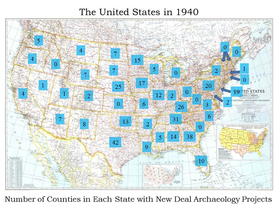 There are complicated factors that determine whether any New Deal archaeology was conducted in a given state, and, even if it was, where in the state New Deal projects took place. Some of the factors include state and local political opposition to the New Deal in general, lack of an infrastructure or interest in archaeology, or simply a decision to cut back on archaeological efforts until the economy improved.