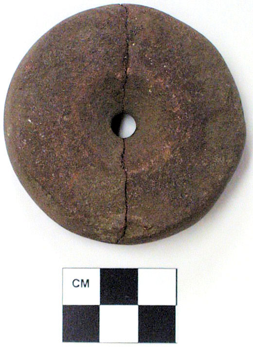 The chunkey stone itself came from the village site of Fort Hill, located in Somerset County, Pennsylvania, and was indirectly dated to the 13th century A.D. through accelerator mass spectrometry (AMS), a form of radiocarbon dating. Chunkey stones were used in a game involving two players. The stone was rolled along the ground—sometimes on a prepared earthen court—and the two players threw carved wooden sticks at the location where they thought the stone would come to a rest without hitting the stone itself. The Fort Hill chunkey stone clearly was struck and the original object was split in half, but later mended after it was excavated.